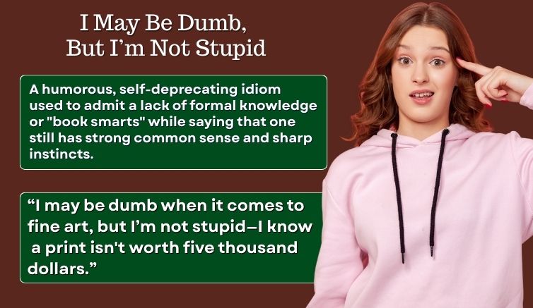 I may be dumb, but I’m not stupid is a humorous, self-deprecating idiom used to admit a lack of formal knowledge or “book smarts” while saying that one still has strong common sense and sharp instincts. It is a defensive way of saying, “I may not know a lot, but I know when I’m being cheated or lied to.” In other words, it means, “I may be stupid, but I’m not as stupid as you think I am.