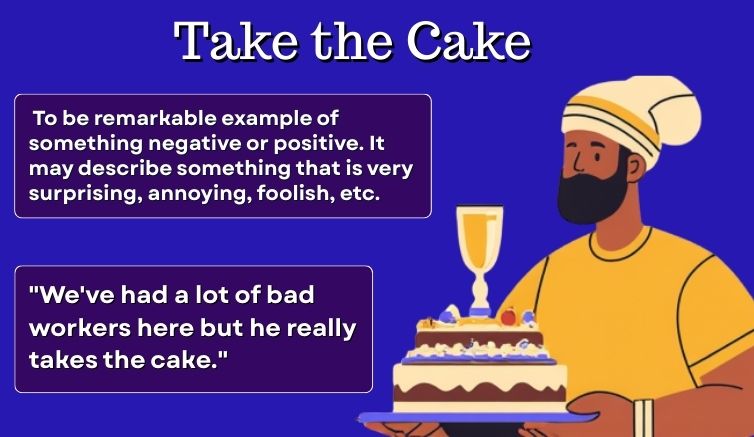 When something takes the cake it is a remarkable example of something negative or positive. It may describe something that is very surprising, annoying, foolish, etc.