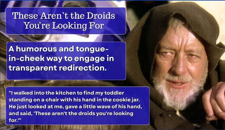Saying ‘these aren’t the droids you’re looking for’ is a humorous and tongue-in-cheek way to engage in transparent redirection. It is used when someone has been caught in an obvious truth or a compromising situation and attempts to ‘wave away’ the facts with a redirection so bold and absurd that it acknowledges the guilt it’s trying to hide.